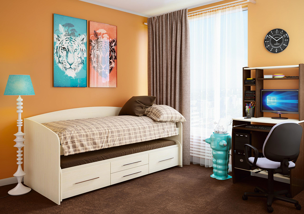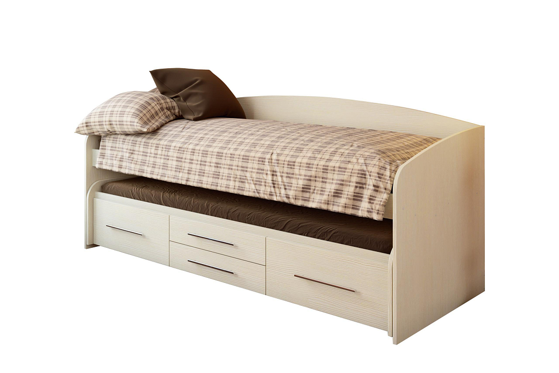 Двухъярусная кровать «Адель-5» имеет весьма необычную компоновку. У неё выдвижное нижнее спальное место, благодаря чему общая высота кровати составляет всего 66 см. Нижний блок оснащён двумя большими выдвижными ящиками, а так же одним малым выдвижным ящиком посередине для постельных принадлежностей, а также колёсиками, поэтому для его выдвигания вам не потребуется значительных усилий. Кровать оборудована боковинами и задней спинкой.