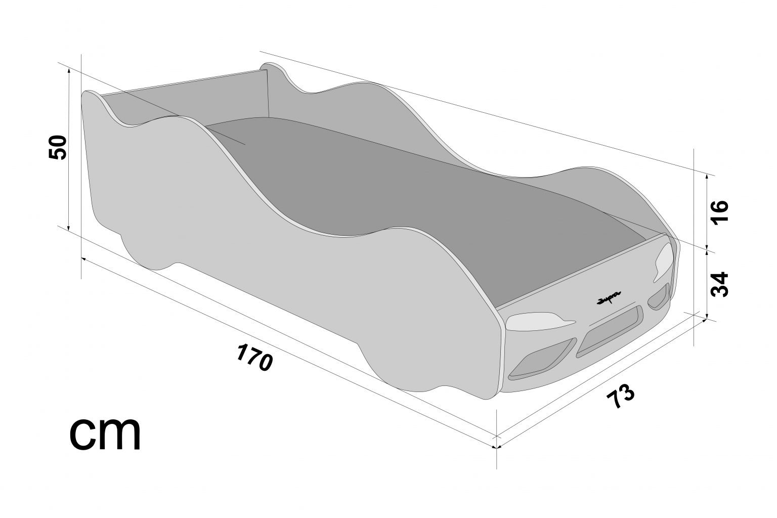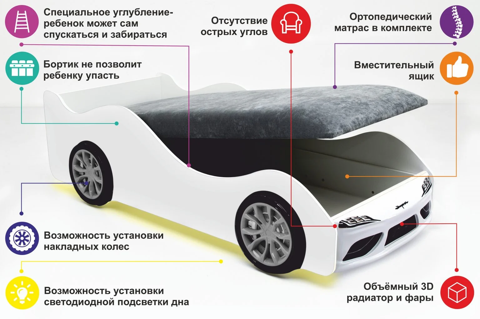 Каркас кровати выполнен из экологичного ЛДСП класса эмиссии Е1, соответствует всем стандартам качества. Кровать оборудована объемным бампером из ABS-пластика, к нему прилагаются наклейки в виде фар, радиаторной решётки и логотипа автомобиля. Все края кровати покрыты кромкой ПВХ 1 мм и безопасны для малышей.