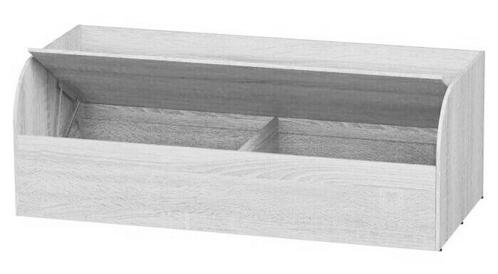 Детская кровать "Трио" оснащена основанием из настила ЛДСП с подъемным механизмом, открывающим доступ к вместительному бельевому ящику.