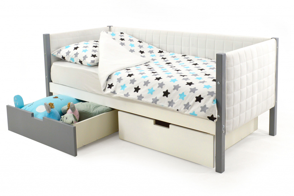 Комплект кровати состоит из каркаса кровати, мягких чехлов на бортики и ортопедического основания. Дополнительный бортик, ящики, матрас и постельные принадлежности приобретаются отдельно.