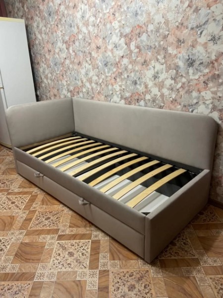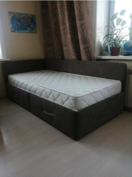 Модель оснащена выкатным ящиком для белья. При изготовлении кровати использованы качественные материалы. Корпус кровати выполнен из экологичных материалов: массива сосны и фанеры. Мягкость боковин и высокой спинки обеспечивает безопасный для здоровья наполнитель – ППУ и синтепон. Основание реечное на лентах. Вы можете выбрать обивку в велюре или рогожке в любом цвете.